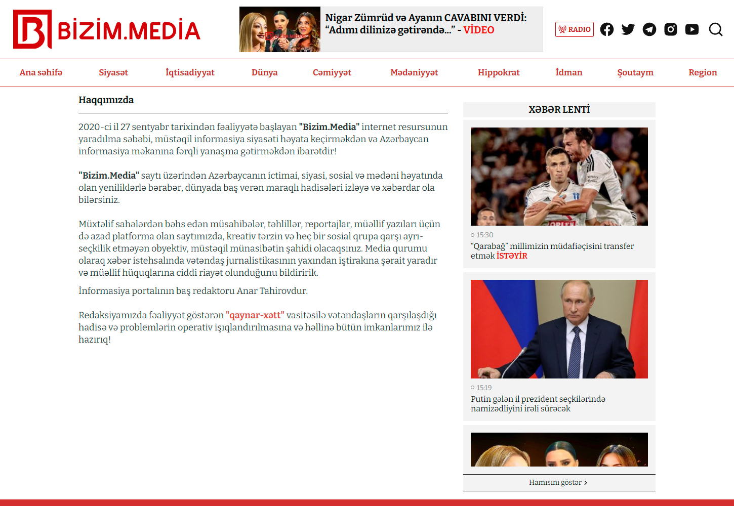 2020-ci il 27 sentyabr tarixindən fəaliyyətə başlayan "Bizim.Media" internet resursunun yaradılma səbəbi, müstəqil informasiya siyasəti həyata keçirməkdən və Azərbaycan informasiya məkanına fərqli yanaşma gətirməkdən ibarətdir!
