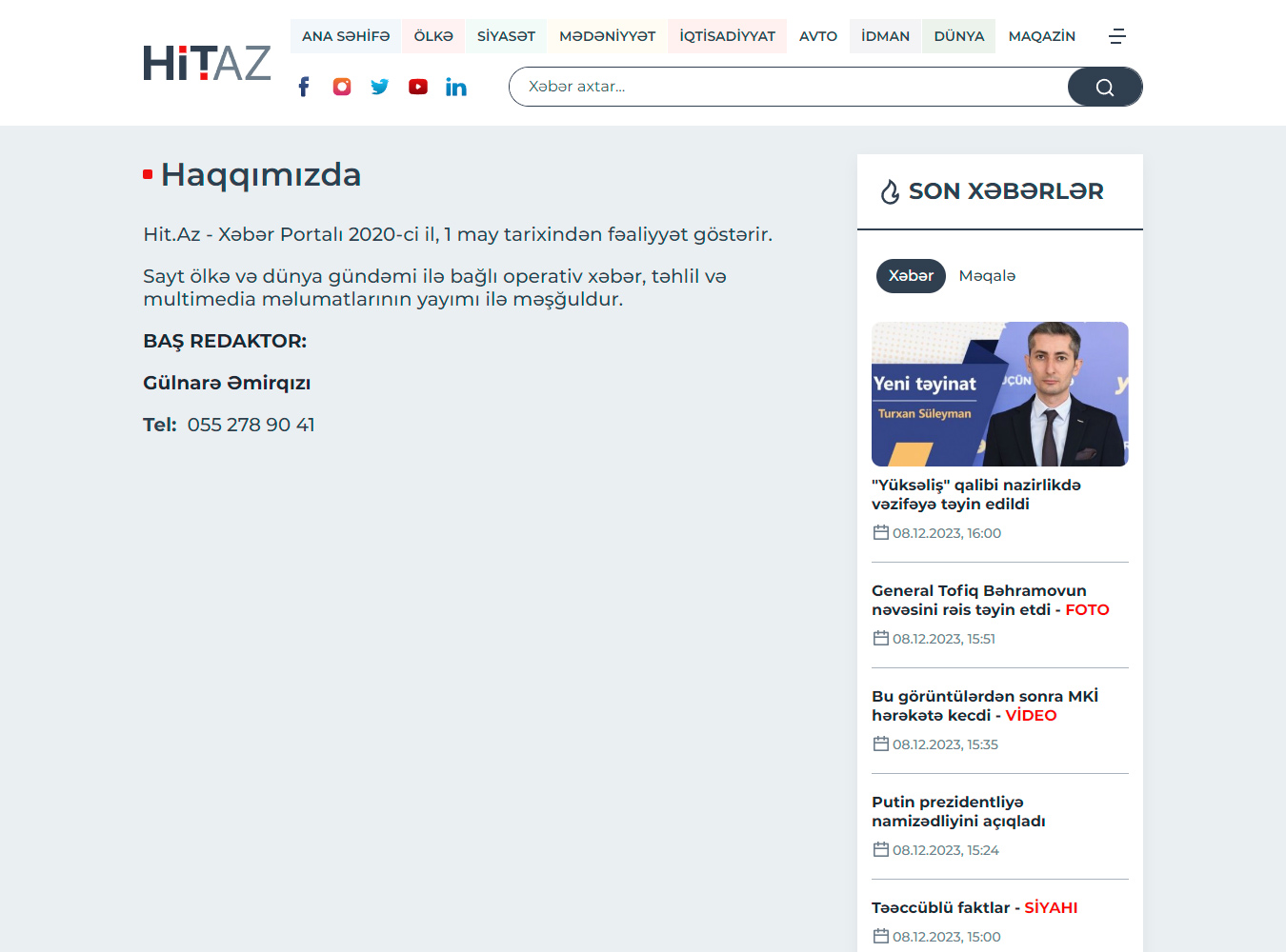 Hit.Az - Xəbər Portalı 2020-ci il, 1 may tarixindən fəaliyyət göstərir.